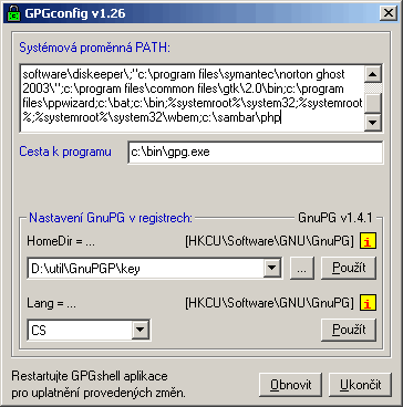 GPGconfigCesta k programumusí obsahovat cestu k gpg.exe - cesta je nalezená automaticky, program prohledává všechny adresáře do nichž vede cestaHomeDir: cesta do adresáře, kde budou uloženy soubory s klíčiLang: jazyk pro gpg.exe